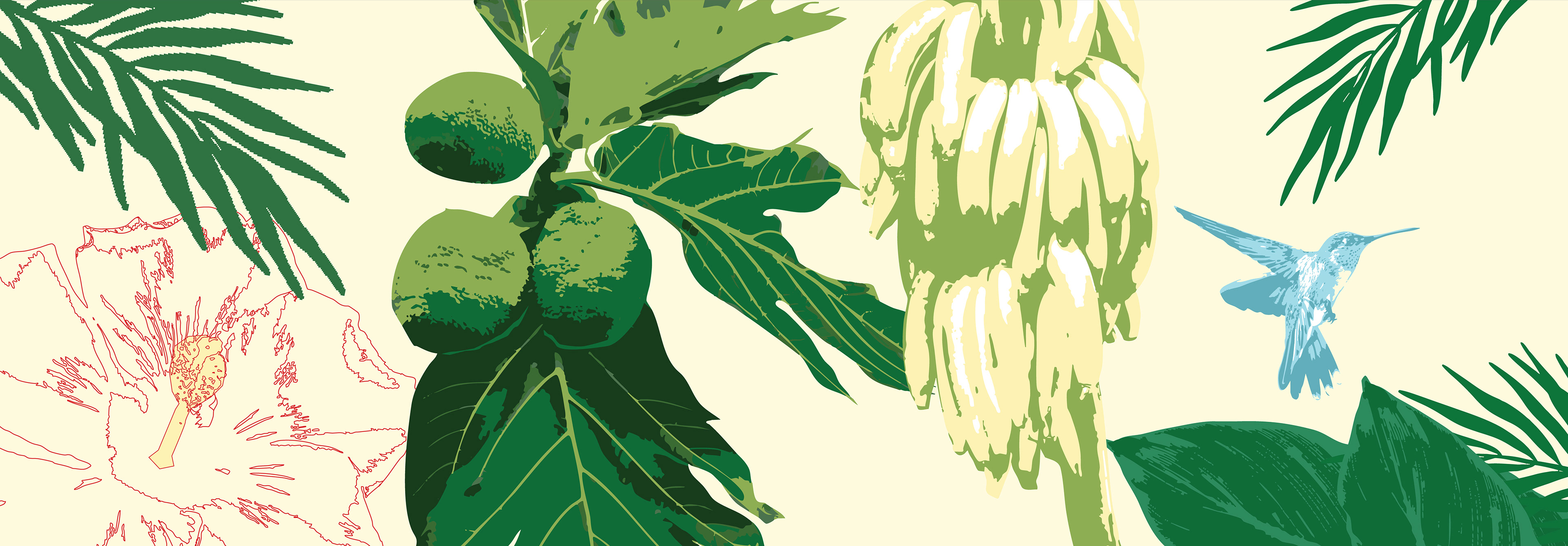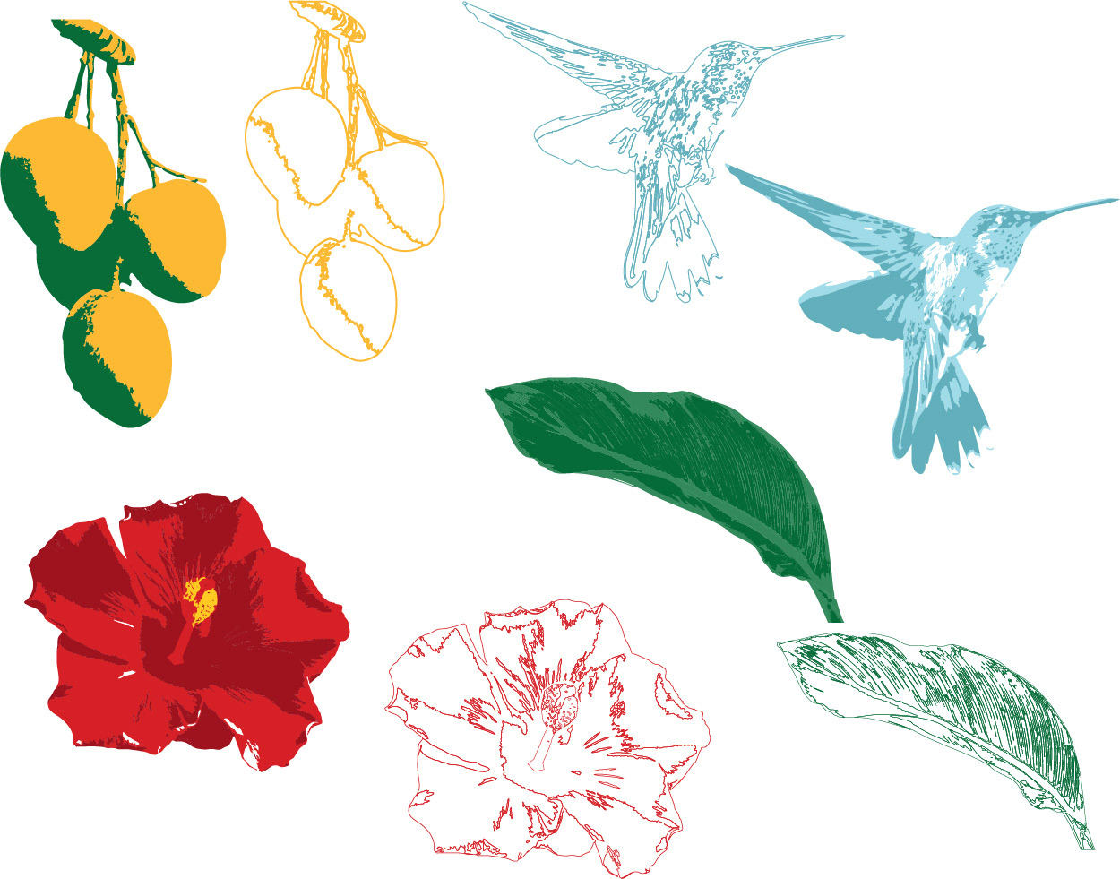 Island Riddim Restaurant Wall Graphics Support: I created illustrations of notable imagery often tied to the Caribbean Island feel, such as mangos, hummingbirds, plantains, and more. These images were then compiled and organized into a nice wall graphic to complement the space. The final wall graphic was designed by Ashalla Design Shop owner, KimShala Hibbert. The video below shows the installed wall graphics!